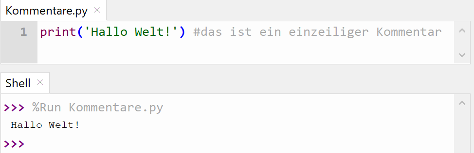 Einzeilige Kommentare verwendet man vor allem um knapp zu erleutern, welche Funktion der Programmtext hat. um solch ein Kommentar zu erstellen benutzt man einen Hashtag #. Alles hinter dem Hastag ist nun ein Kommentar und hat keine Auswirkung auf die Funktion des Programms. Beginnt man in einer neuen Zeile zu schreiben, so handelt es sich wieder um normeln Programmtext.